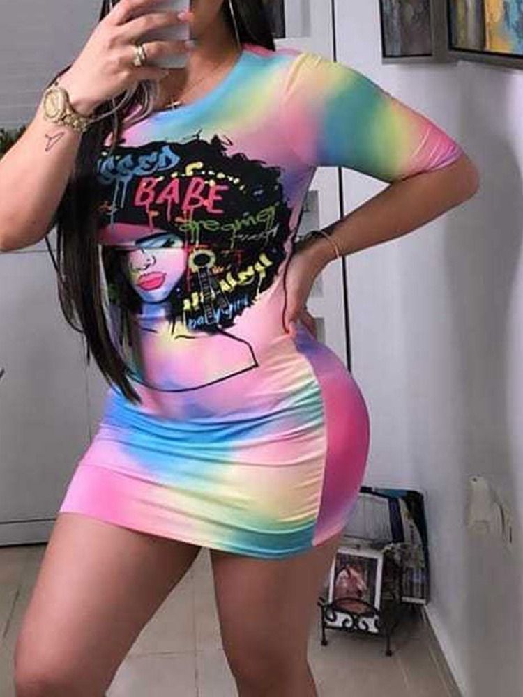 Bodycon-tryck För Kvinnor Ovanför Knä-färgad Rund Klänning