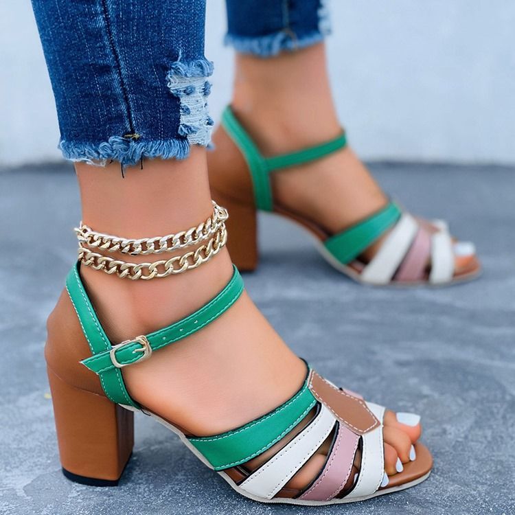 Buckle Chunky Heel Peep Toe Color Block Dam Sandaler