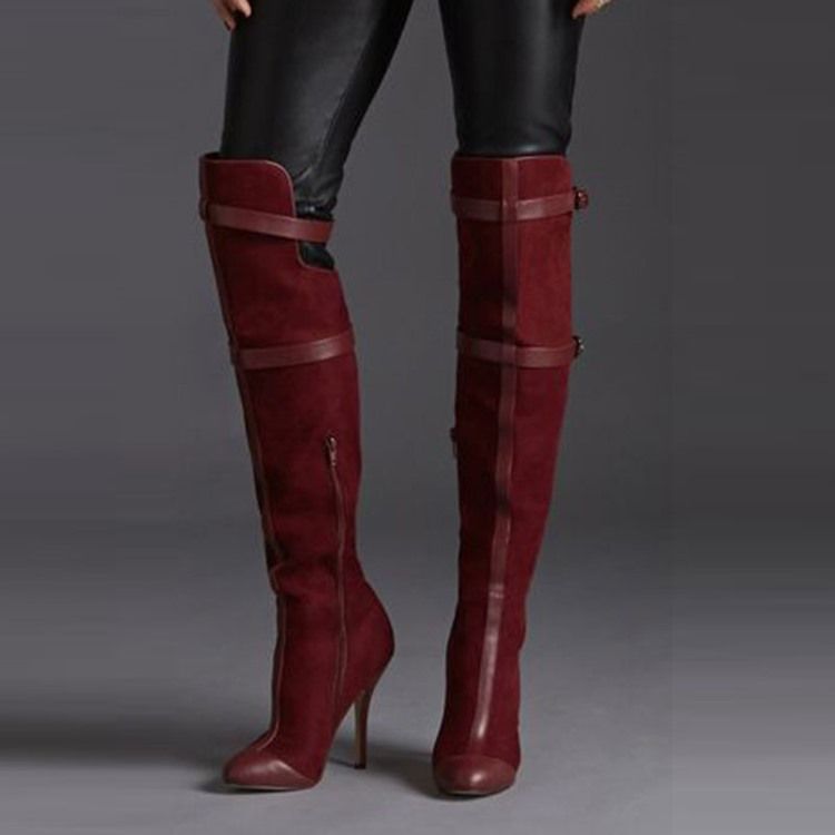 Burgundy Point Toe Lårhöga Stövlar För Kvinnor