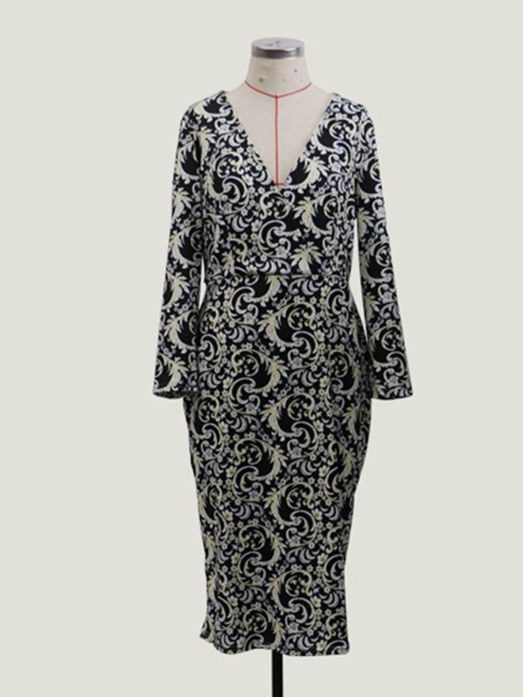 Dam V-ringning Ovanför Knä Långärmad Blommig Vintage Klänning