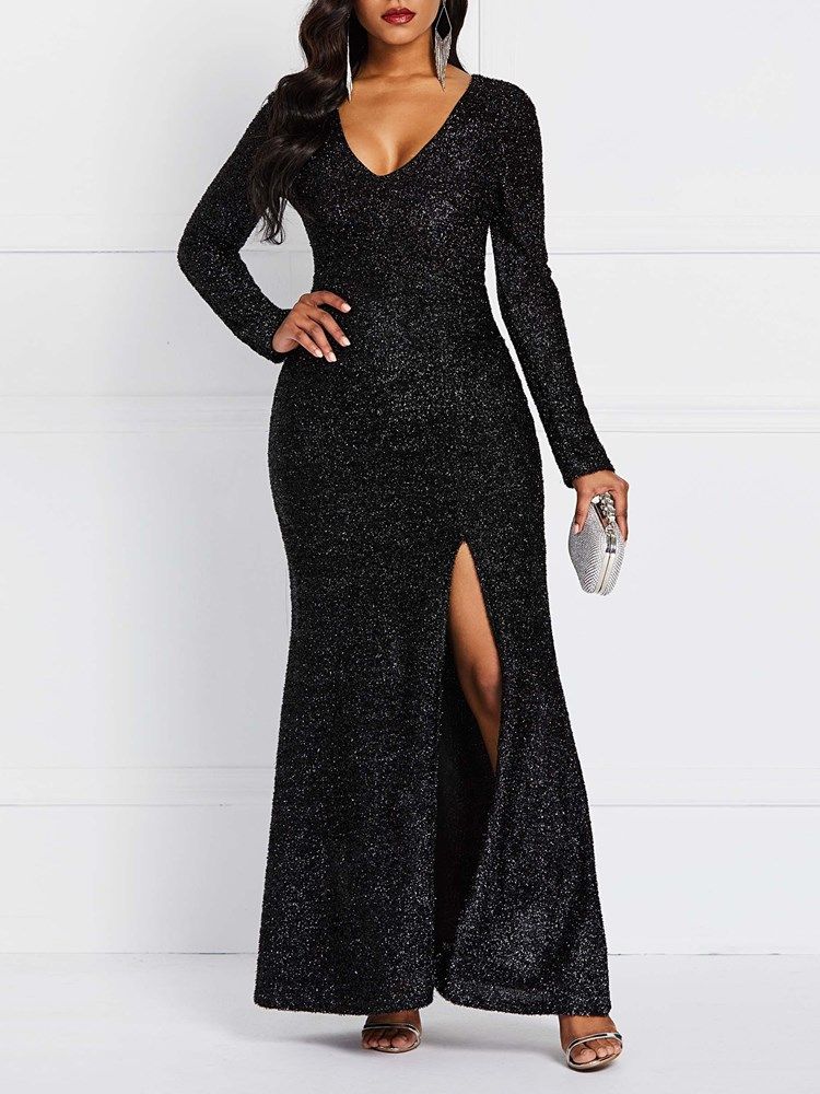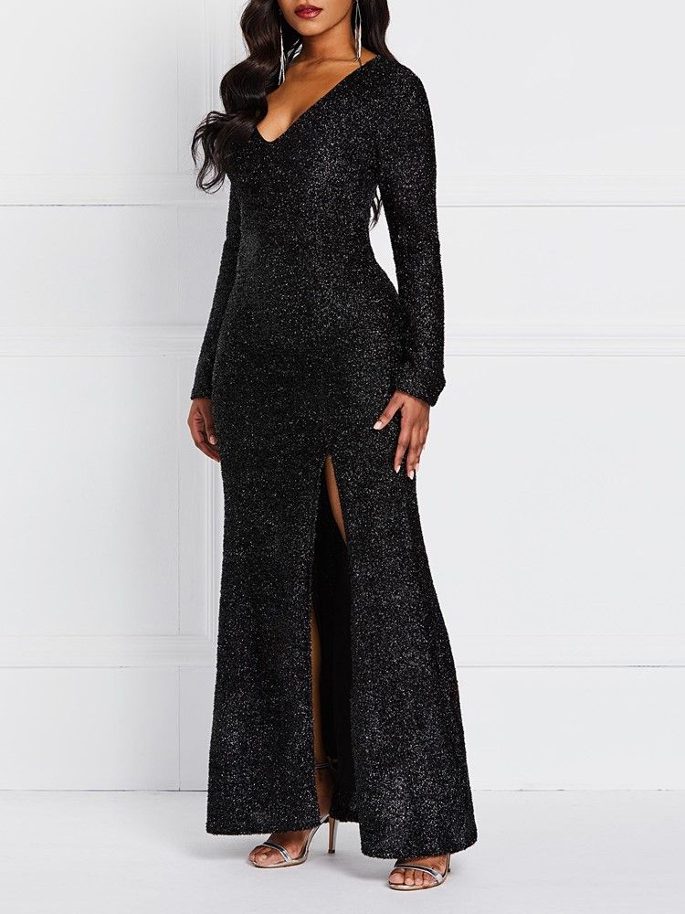 Damklänning Med Ankel-längd Och Lång Ärm V-ringning A-linjeformad Hög Midja