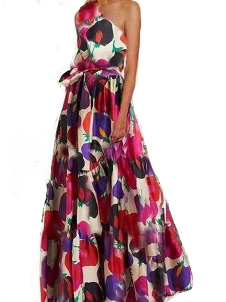 Golvlång Sned Krage Ärmlös Klänning Blommig Damklänning