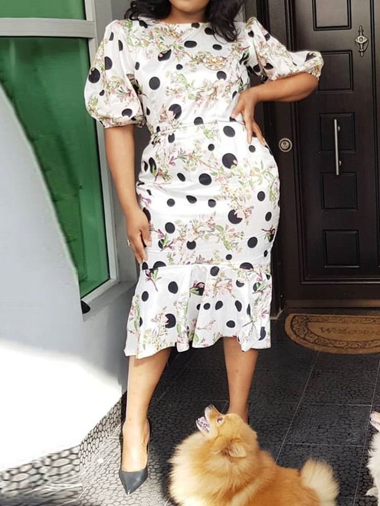 Halv Ärm Falbala Rund Hals Bodycon Blommig Damklänning