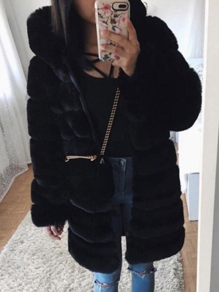 Hooded Plain Long Loose Dam Faux Fur Overcoat