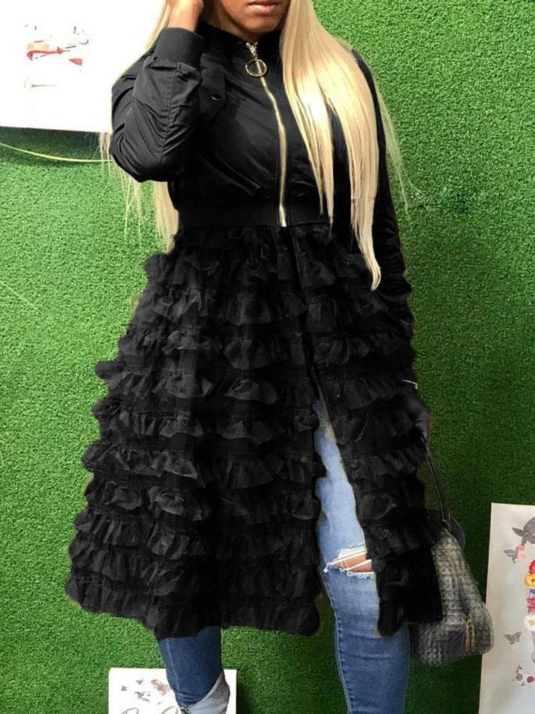 Kvinnor Mesh Dragkedja Stativ Krage Våren Hemline Peplum Trenchcoat