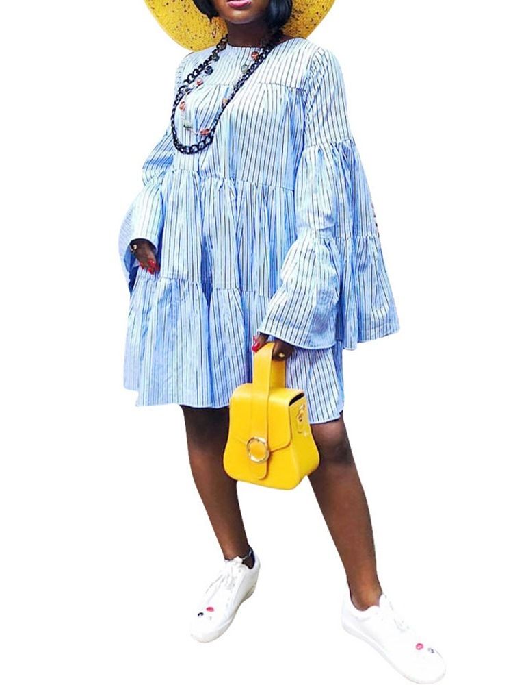 Kvinnor Rund Hals Rand Veckad Avslappnad Hög Midja Casual Klänning