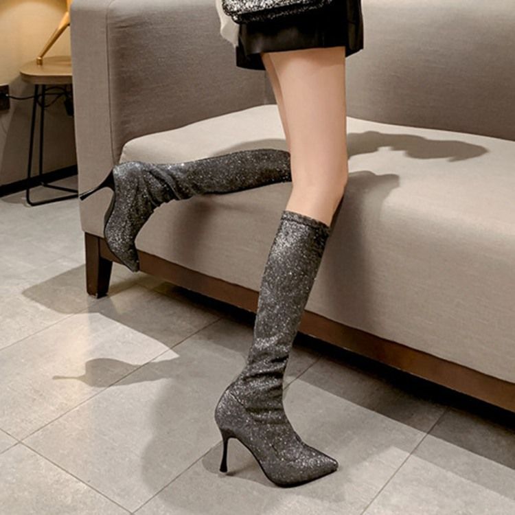 Kvinnor Slip-on Spetsiga Glitter Knä Höga Stövlar