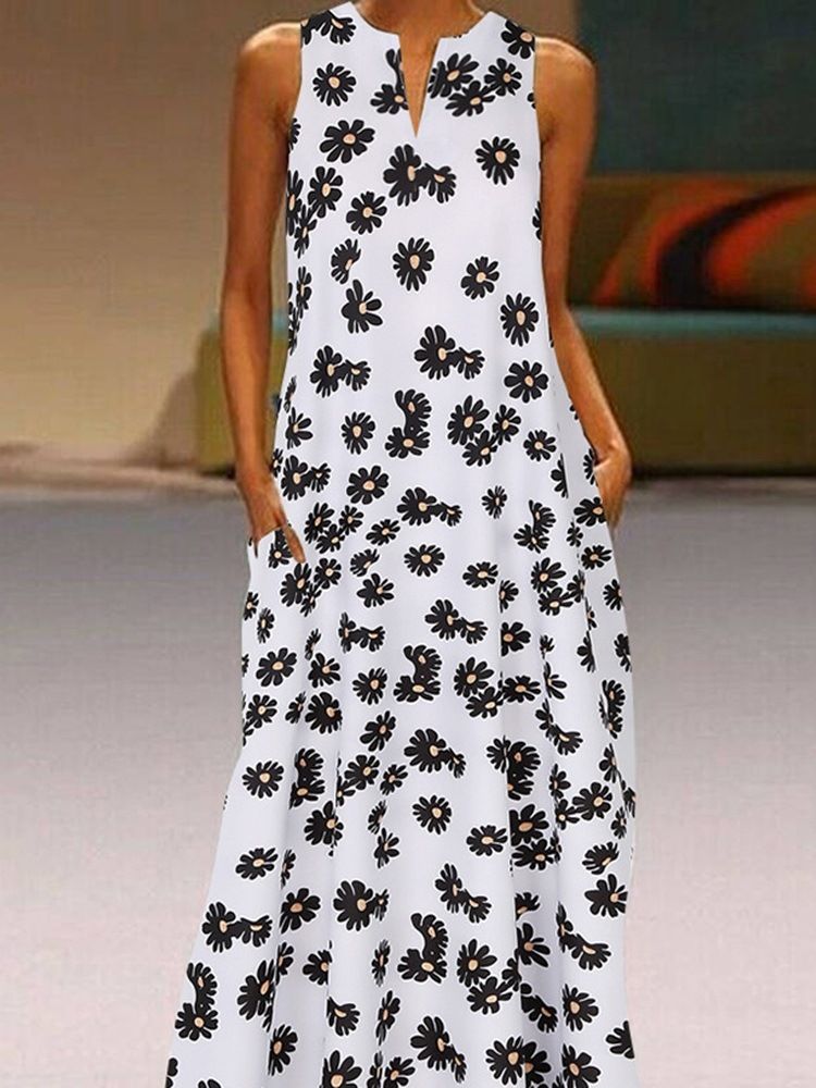 Kvinnors Ärmlösa V-ringad Avslappnad Midjeklänning Med Tryck