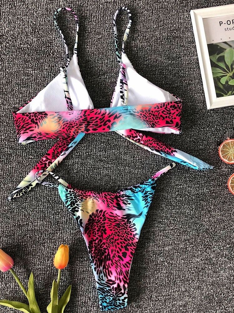 Kvinnors Färgblock Print Bowknot Lace-up Sexig Bikini