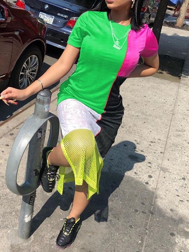 Kvinnors Färgblock Rundhals Kortärmad Patchwork Klänning