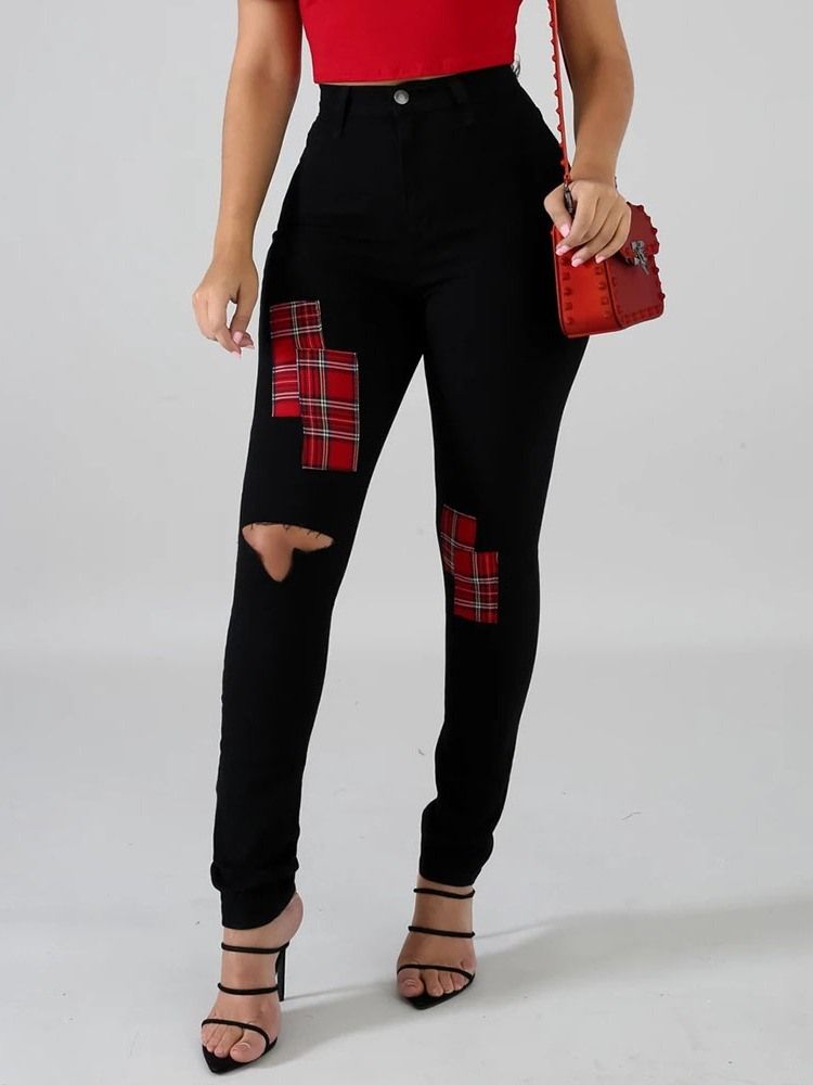 Kvinnors Hål Color Block Pencil Pants Hole Skinny Jeans