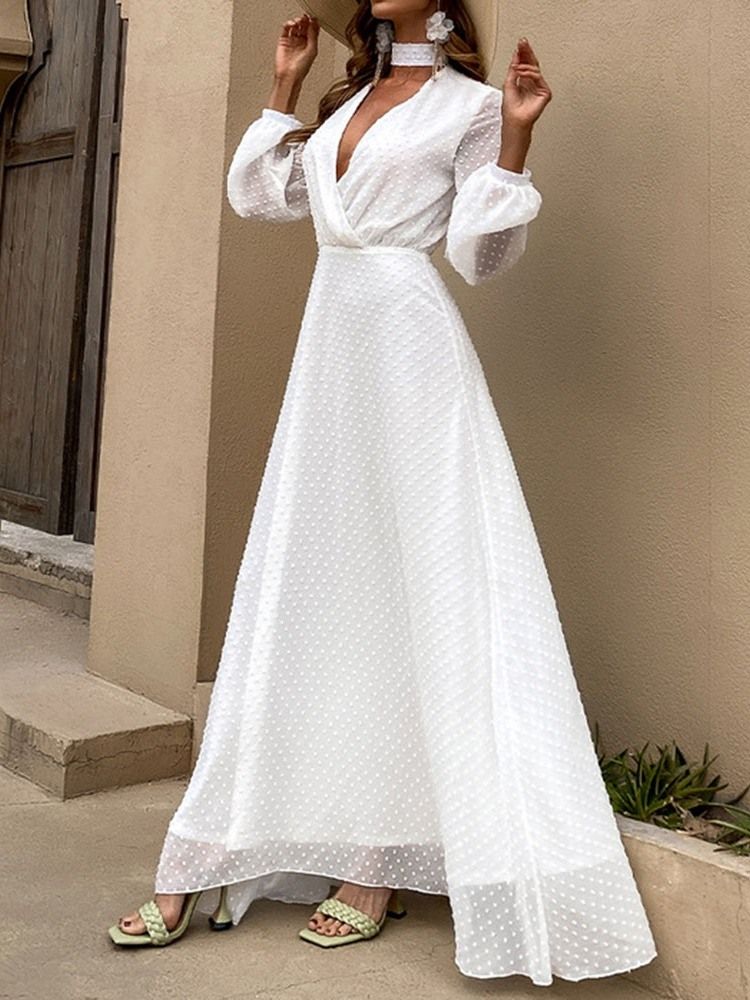 Kvinnors Långärmade Golvlång V-ringad Hög Midja Pullover Vit Maxiklänning