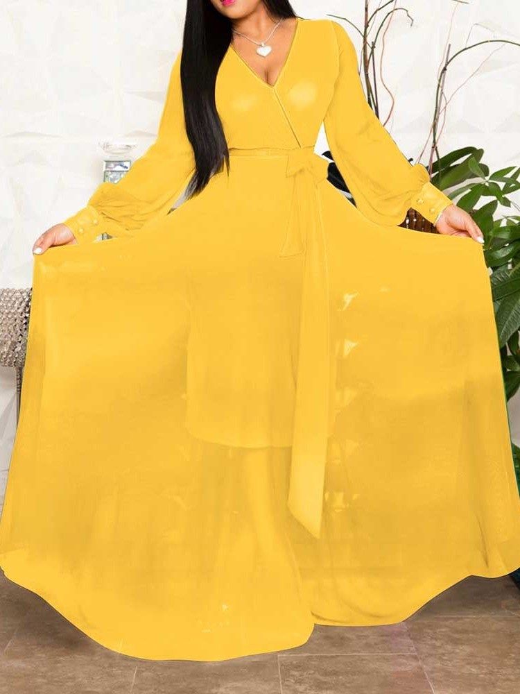 Kvinnors Långärmade V-ringning Golvlängd Expansion Mitt Midja Klänning