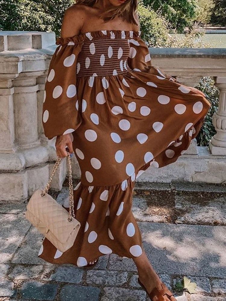 Kvinnors Lapptäcke Långärmad Off Shoulder-prickig Klänning Med Prickar