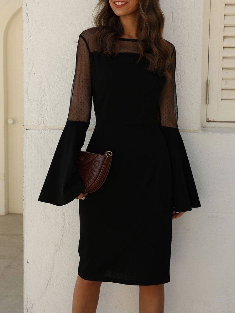 Kvinnors Rundhalsade Patchwork Knälång Tröja Med Flare Ärmklänning
