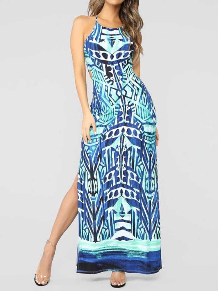 Kvinnors Tryck Ärmlös Golvlång Rygglös Midja Geometrisk Klänning