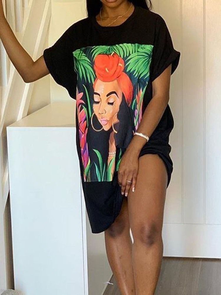 Kvinnors Tryck Knälång Rund Hals Sommar Pullover Klänning