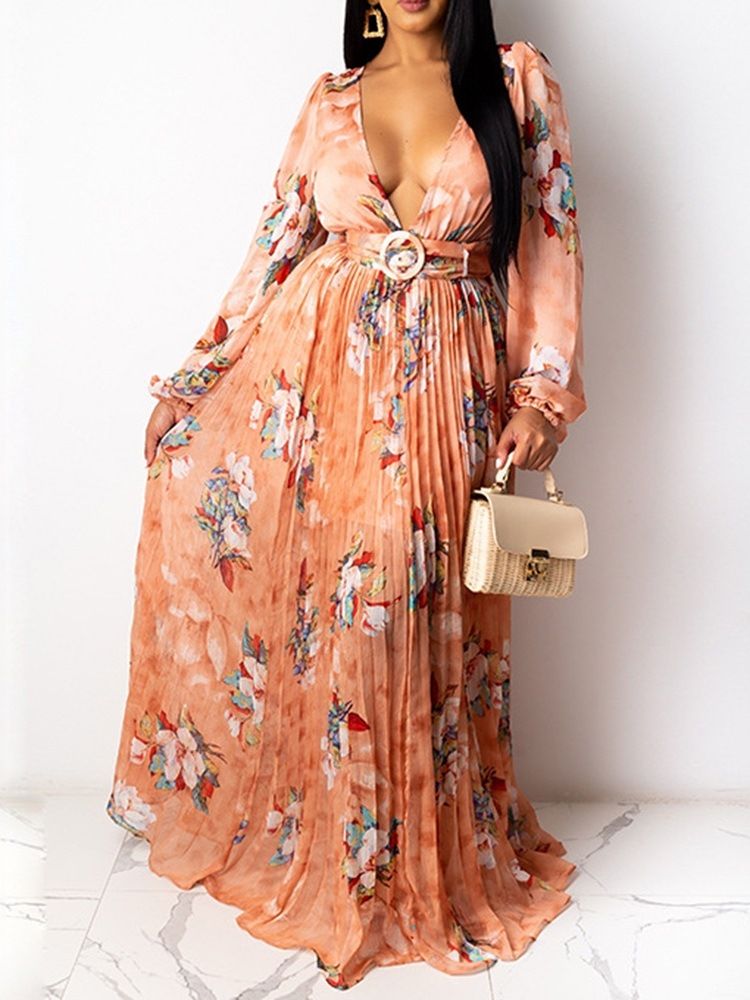 Långärmad Golvlångt Tryck Plisserad Damklänning