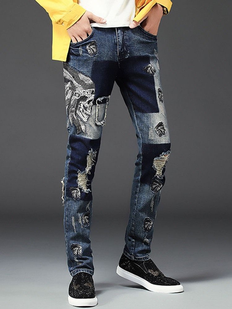 Mäns Hålfärgade Blockpennbyxor Mid Midja Dragkedja Jeans