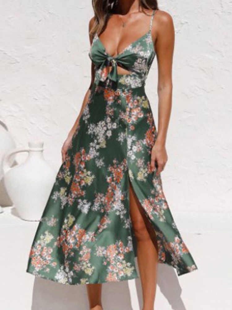 Mid-calf Split Ärmlös A-linje Blommig Maxiklänning Strandklänningar För Kvinnor Bröllopsgästklänning