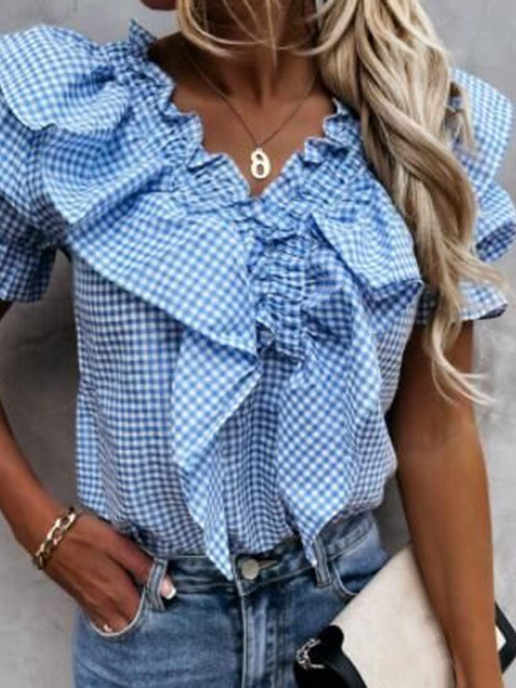 Plaid Stringy Selvedge V-neck Short Sleeve Standard Damblus