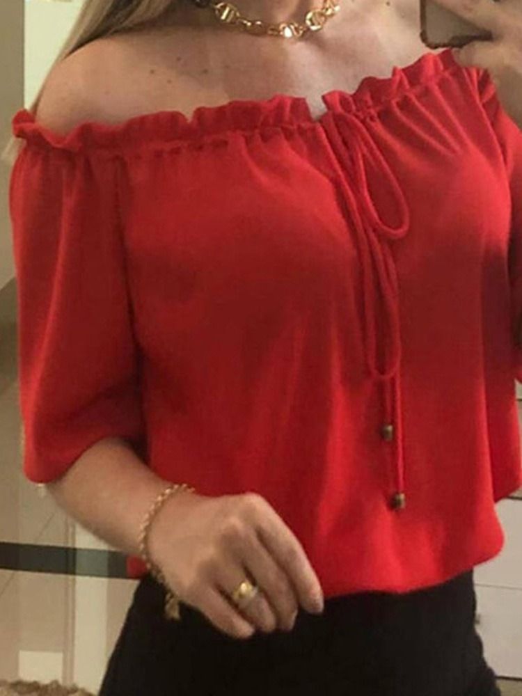Plain Regular Off Shoulder Kortärmad Standard Dam Röd Blus