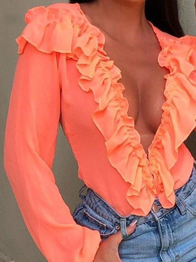 Plain V-ringad Veckad Långärmad Standardblus För Kvinnor