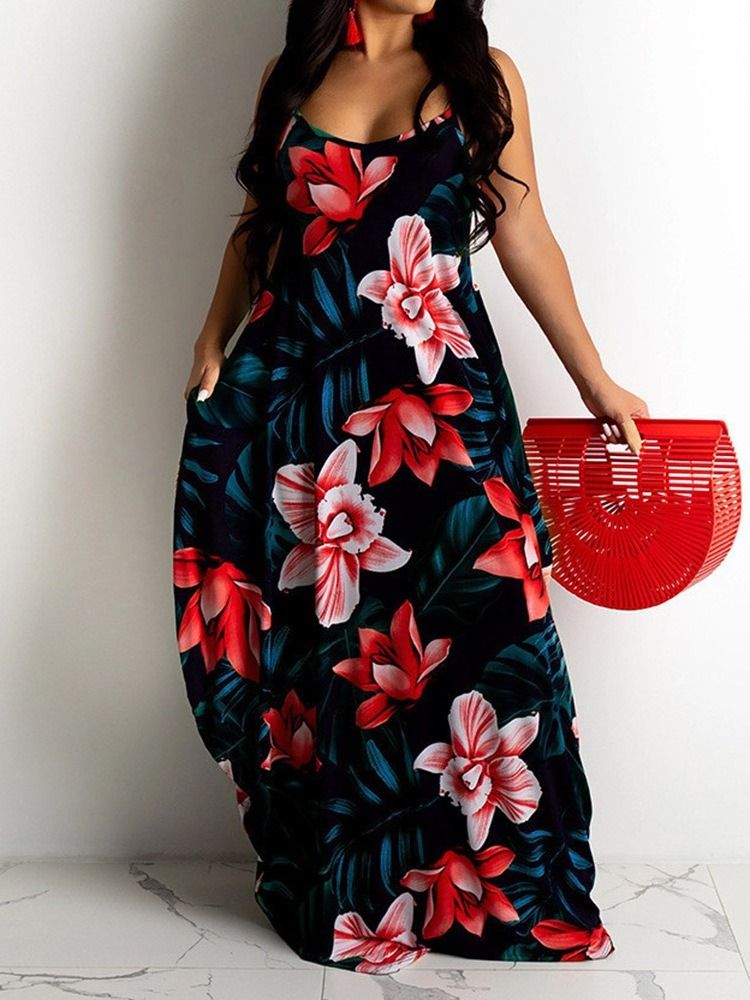 Skriv Golvlång Ärmlös Söt Tröja Blommig Maxiklänning Strandklänningar För Kvinnor