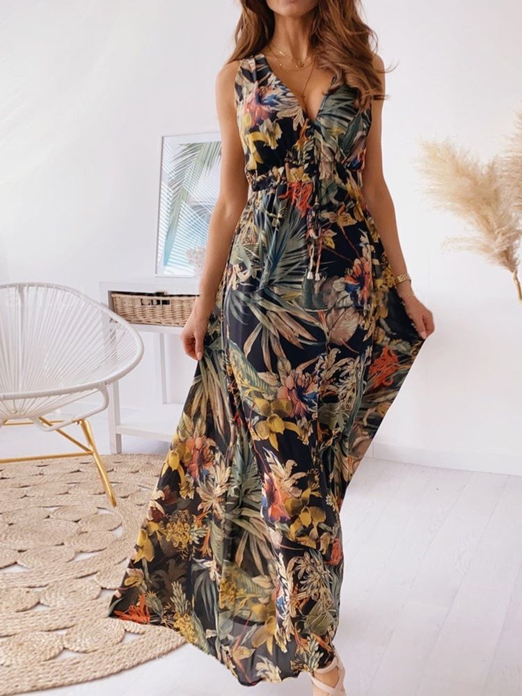 Skriv Golvlång V-ringad Blommig Maxiklänning Strandklänningar För Kvinnor