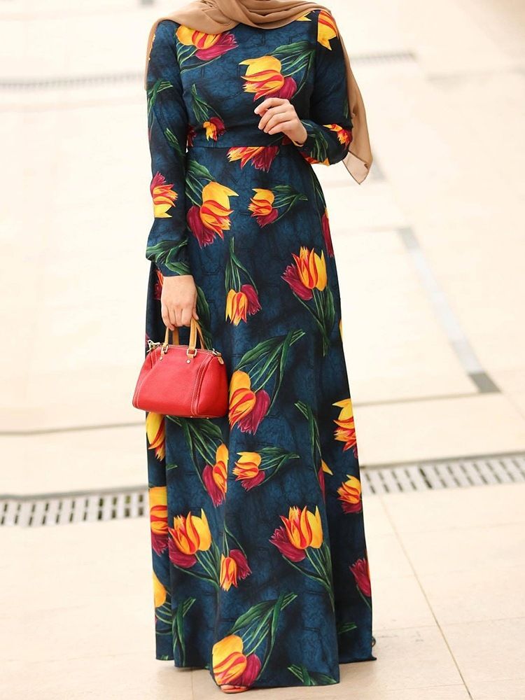 Tryck Långärmad Golvlång Blommig Höstklänning För Kvinnor
