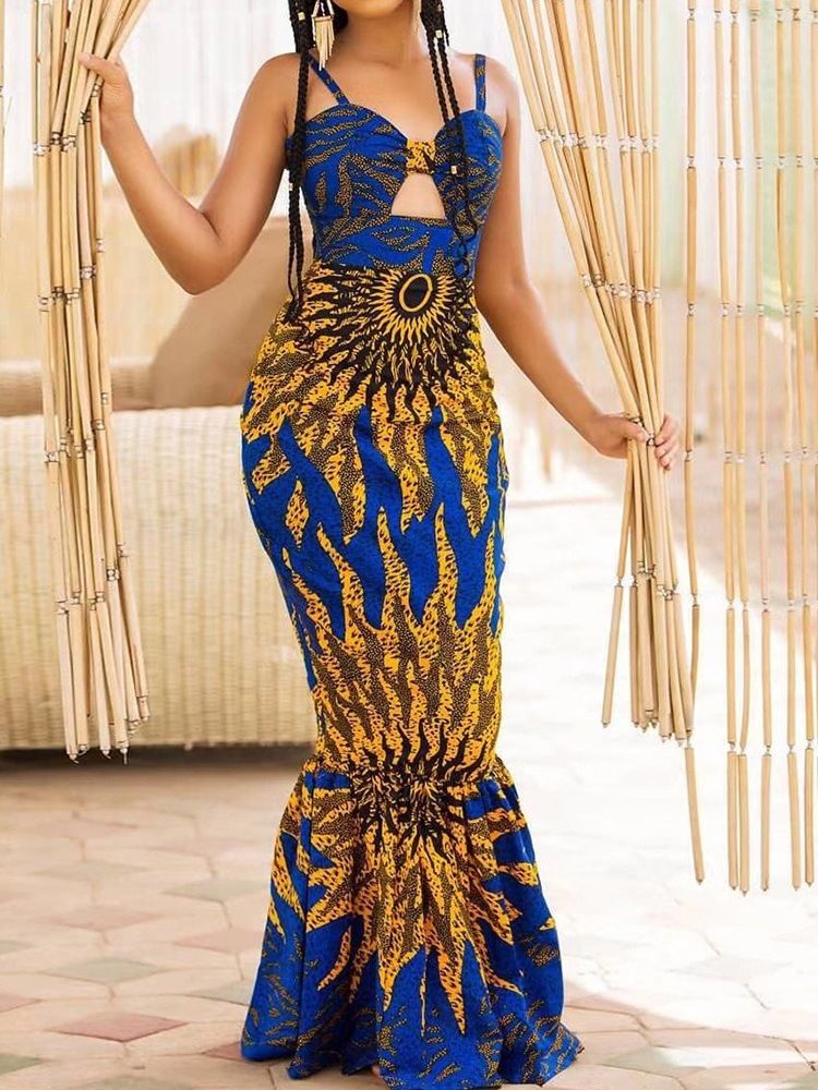 V-ringad Damklänning Med Golvlång Tryck Cocktail Spaghettiklänning