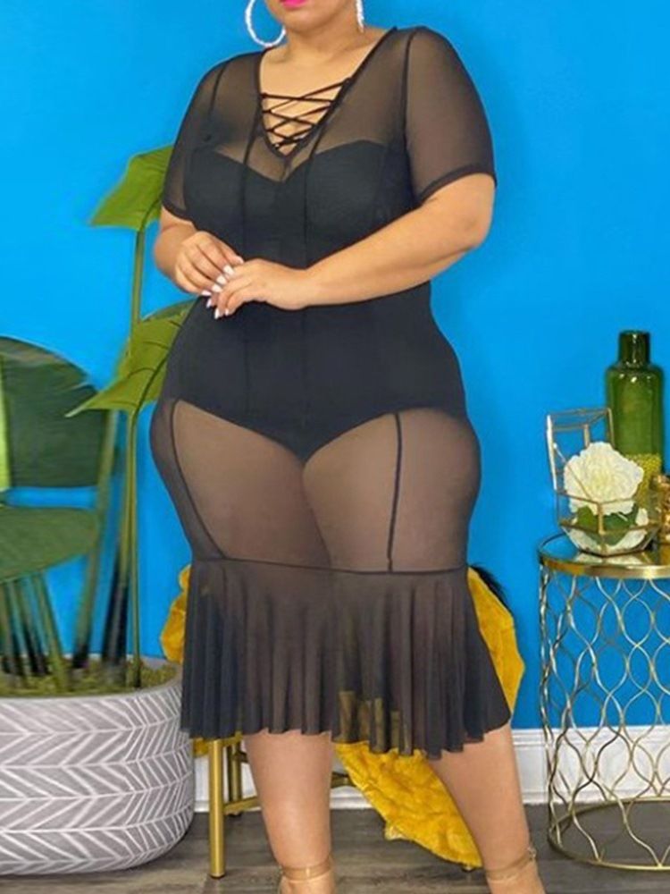 V-ringad Genomskinlig Midikalvdräkt Bodycon-klänning För Kvinnor I Storlek