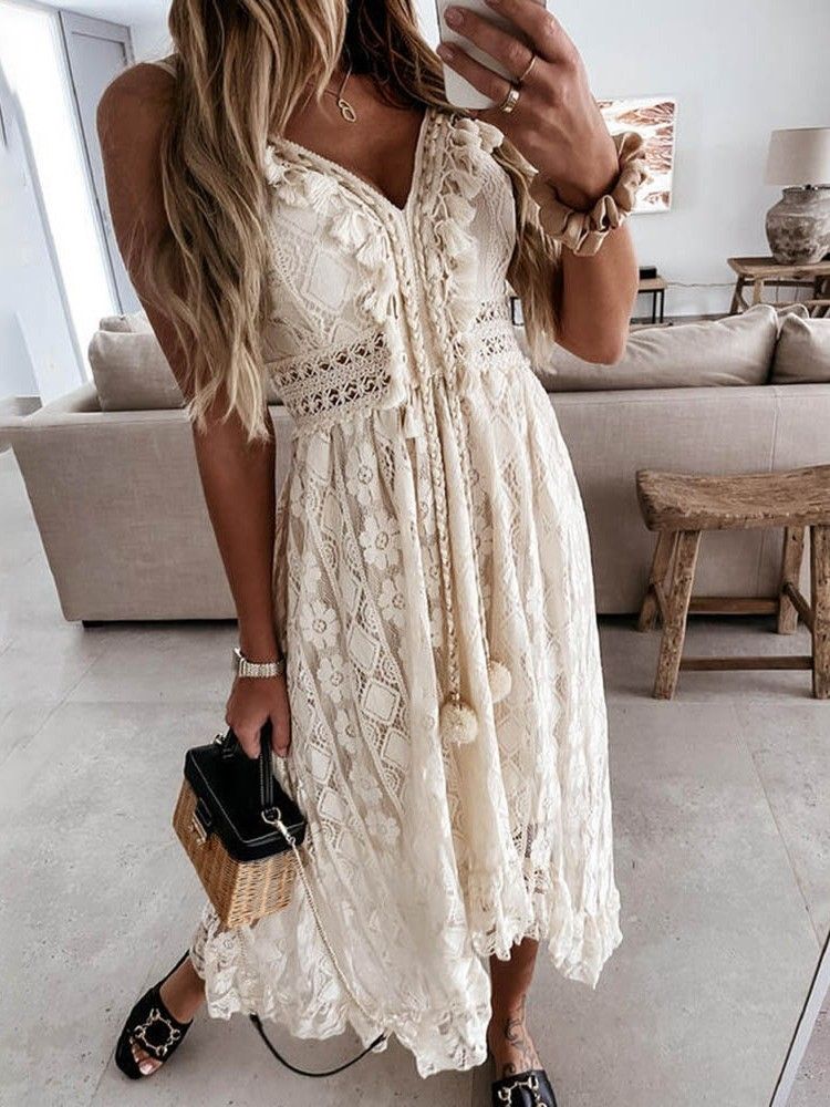 V-ringad Ihålig Fotlängd Vanlig Klänning Strandklänningar För Kvinnor