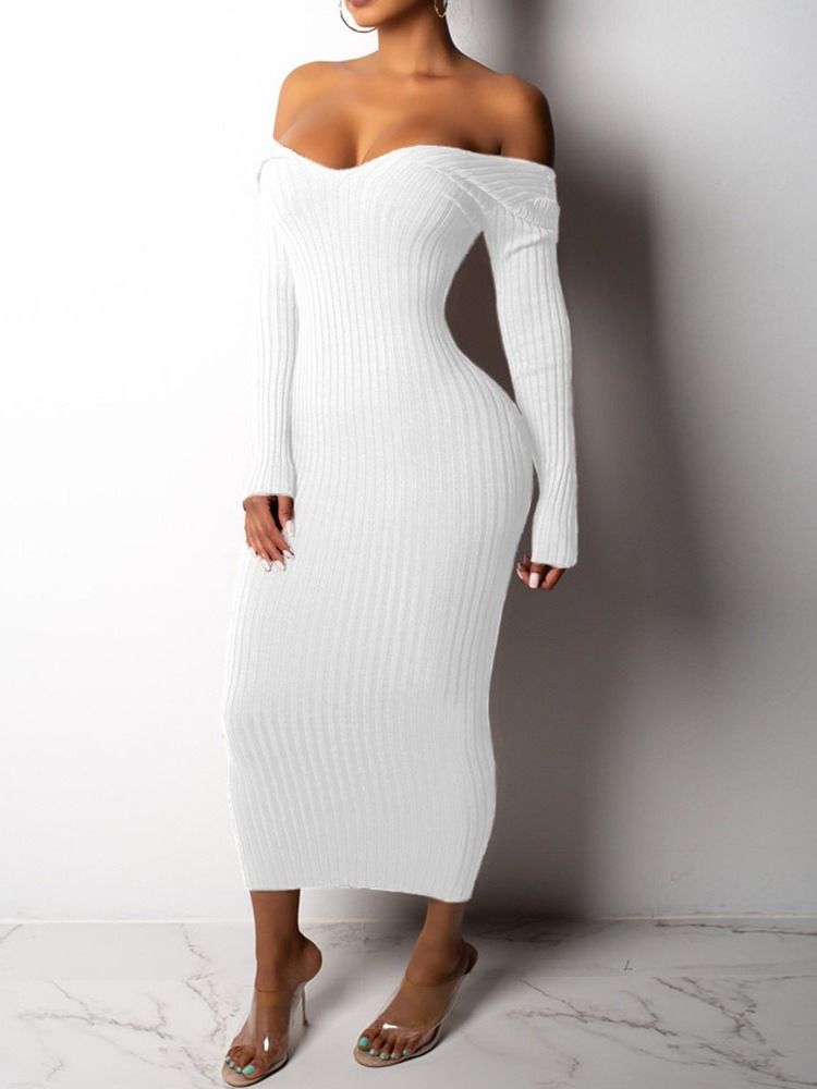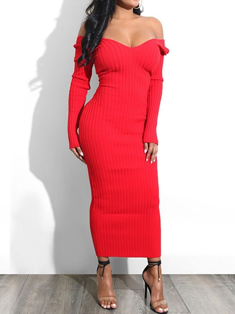 V-ringning Mid-calf Long Sleeve Spring Pullover Damklänning